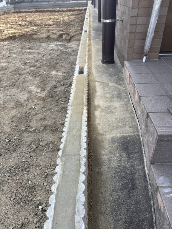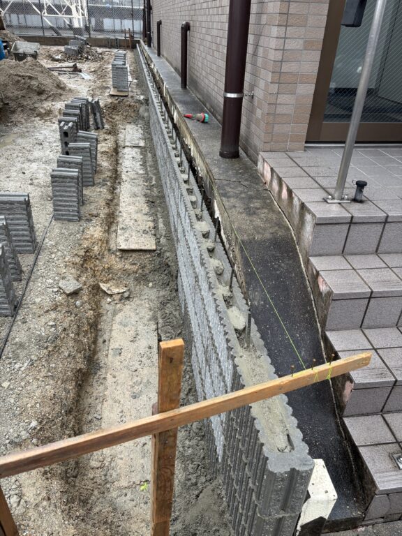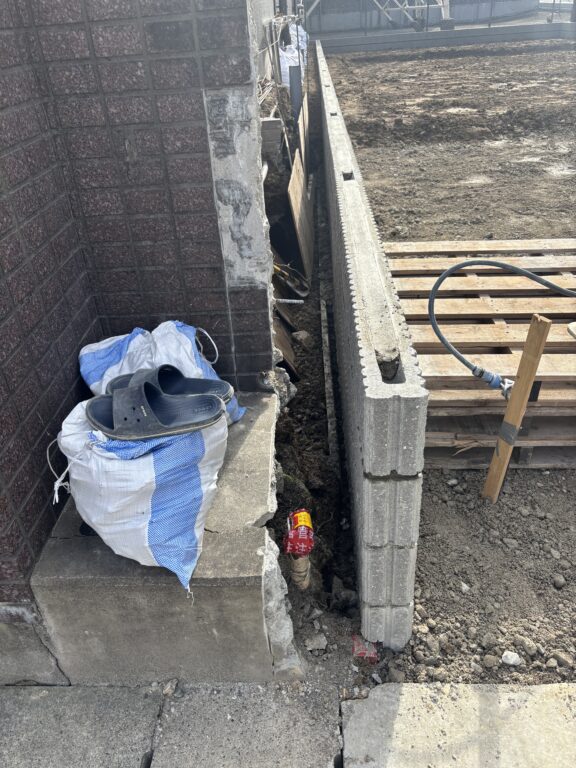残土出し、越境物ハツリ、掘削、CBベース型枠、RC敷き、鉄筋組み、整地、生コン打設、ブロック積みなど、