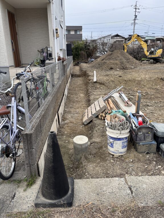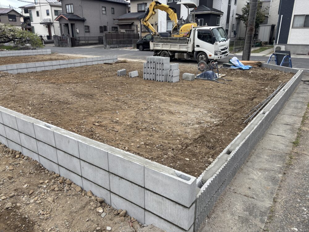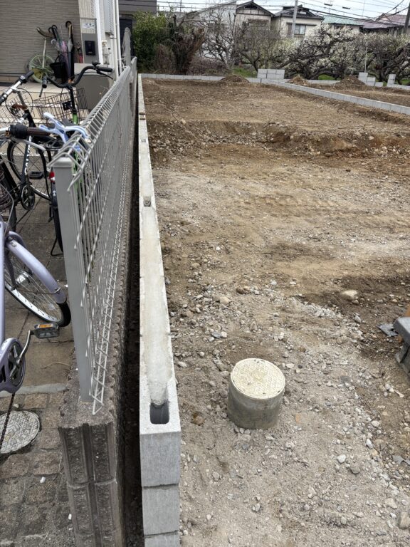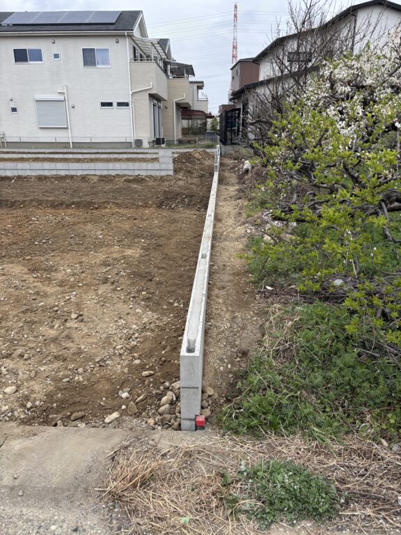 数日かけ残土を出していき、越境物ハツリ、掘削、CBベース型枠、RC敷き、鉄筋組み、整地、生コン打設、CBブロック積みなど、