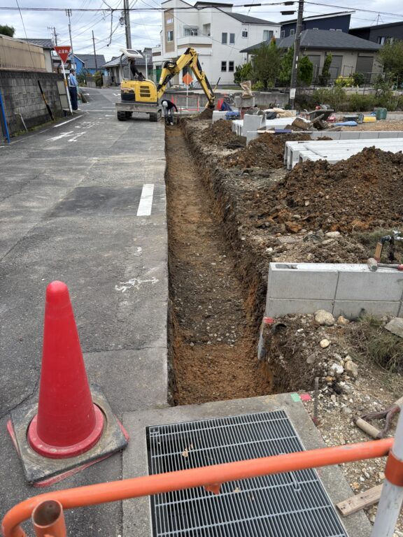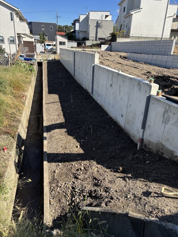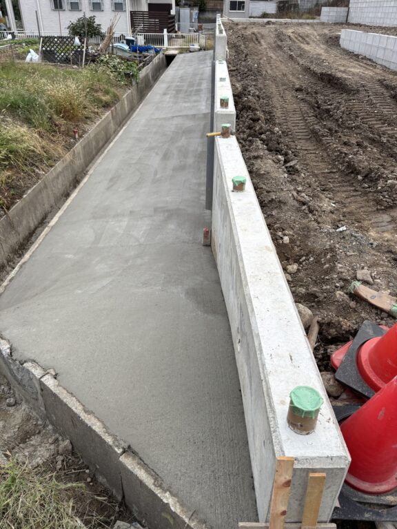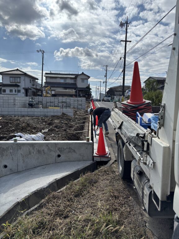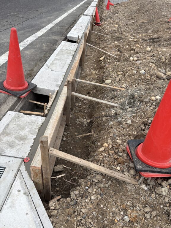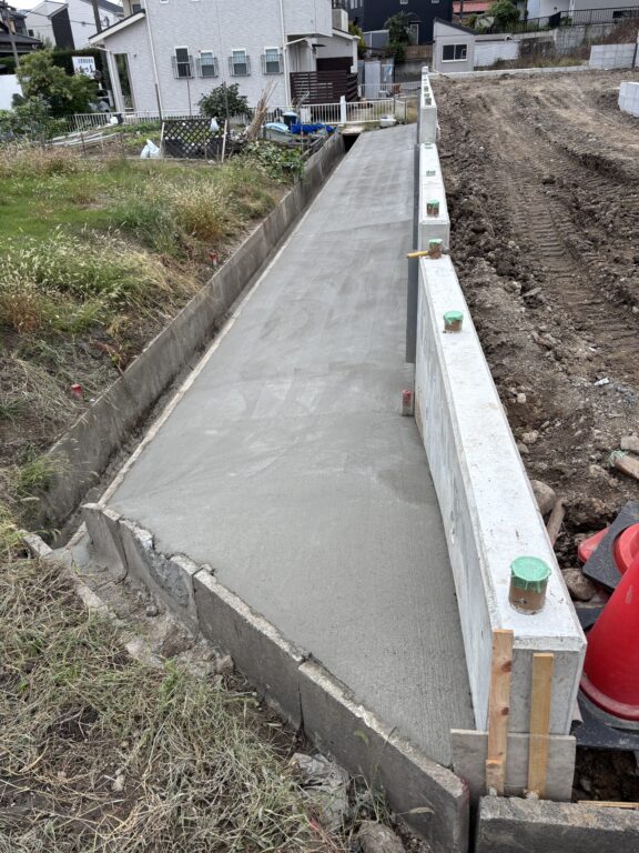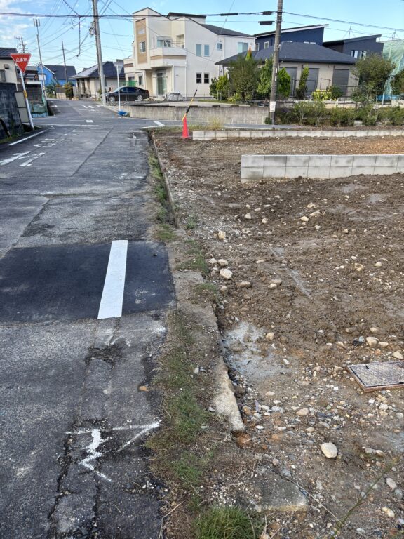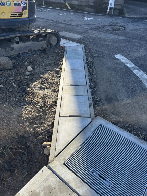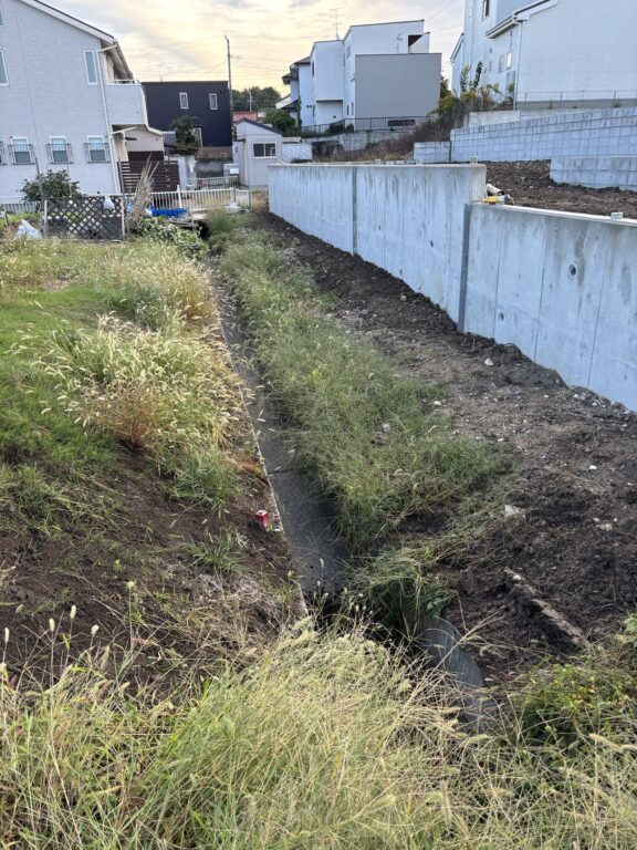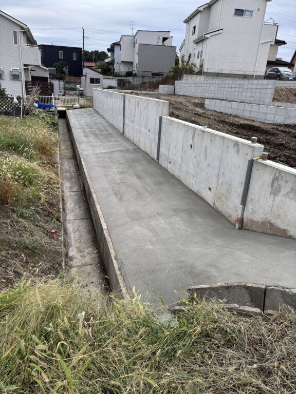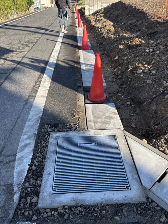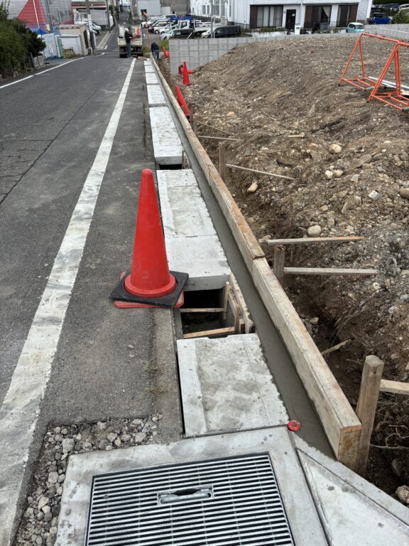 宅地造成工事に伴う、一部側溝入替工事及び、側溝補強コン工事、水路側生コン敷を行う工事となります。